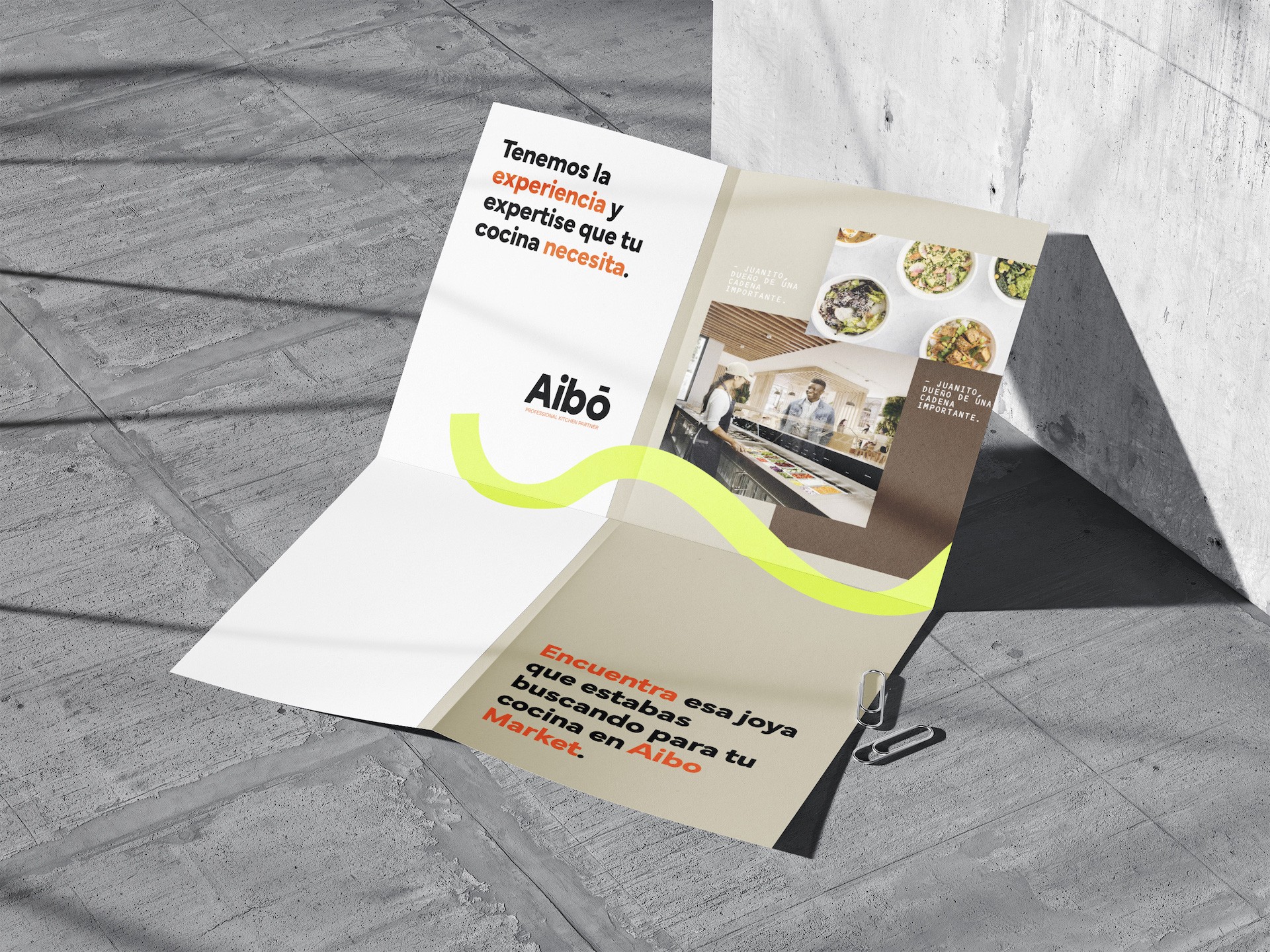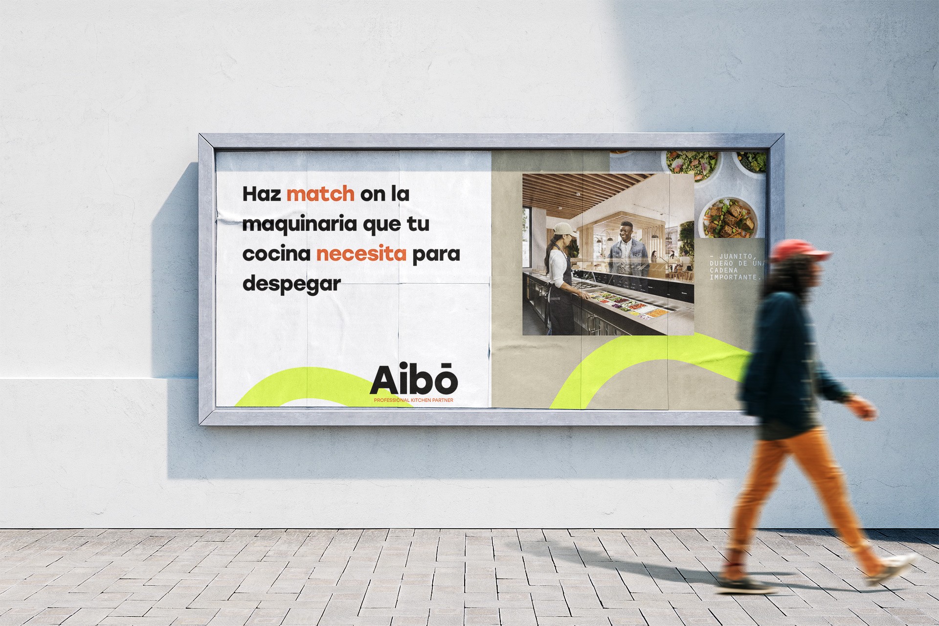Con esa comprensión se definió la esencia de marca: democratizar el acceso a equipamiento profesional y celebrar la pasión por el buen comer. La narrativa posiciona a Aibo Market como el punto de origen donde surgen grandes experiencias culinarias, un espacio que “te cumple” porque está respaldado por décadas de conocimiento técnico. El naming exigía una palabra breve, sin significados previos, capaz de construir un universo propio; así nació Aibo, término sonoro y memorable al que se añadió el descriptor “Market” para anclar la función comercial. El tagline Professional kitchen partner refuerza la promesa de acompañamiento experto y muestra a la plataforma como aliada de crecimiento.