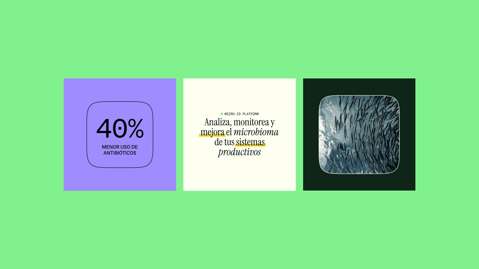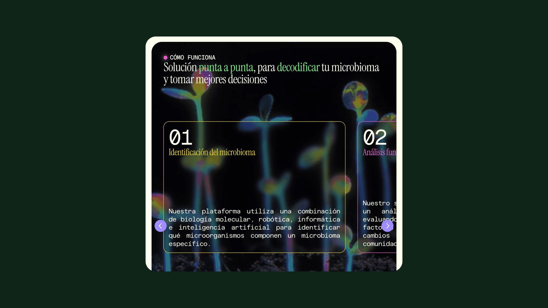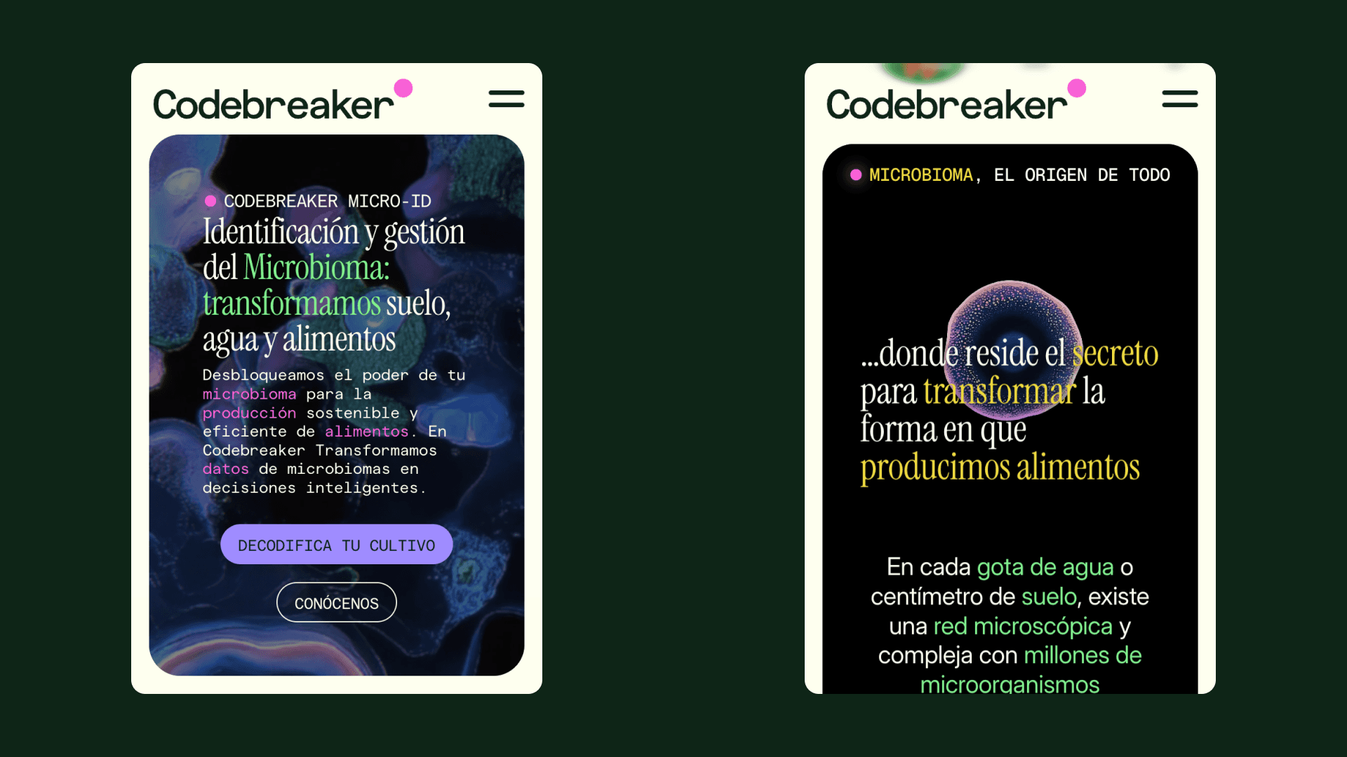 Para expresar esa esencia se creó el sistema de diseño MicroWorld. Gráficos basados en patrones microbianos, una paleta de verdes petróleo con blancos luminosos y tipografías modernas de alta legibilidad transmiten vida, limpieza y rigor. Los puntos y líneas aluden al universo invisible que la plataforma revela; el resultado refuerza la promesa de “ver lo que otros no ven” y transformar esa visión en rendimiento.