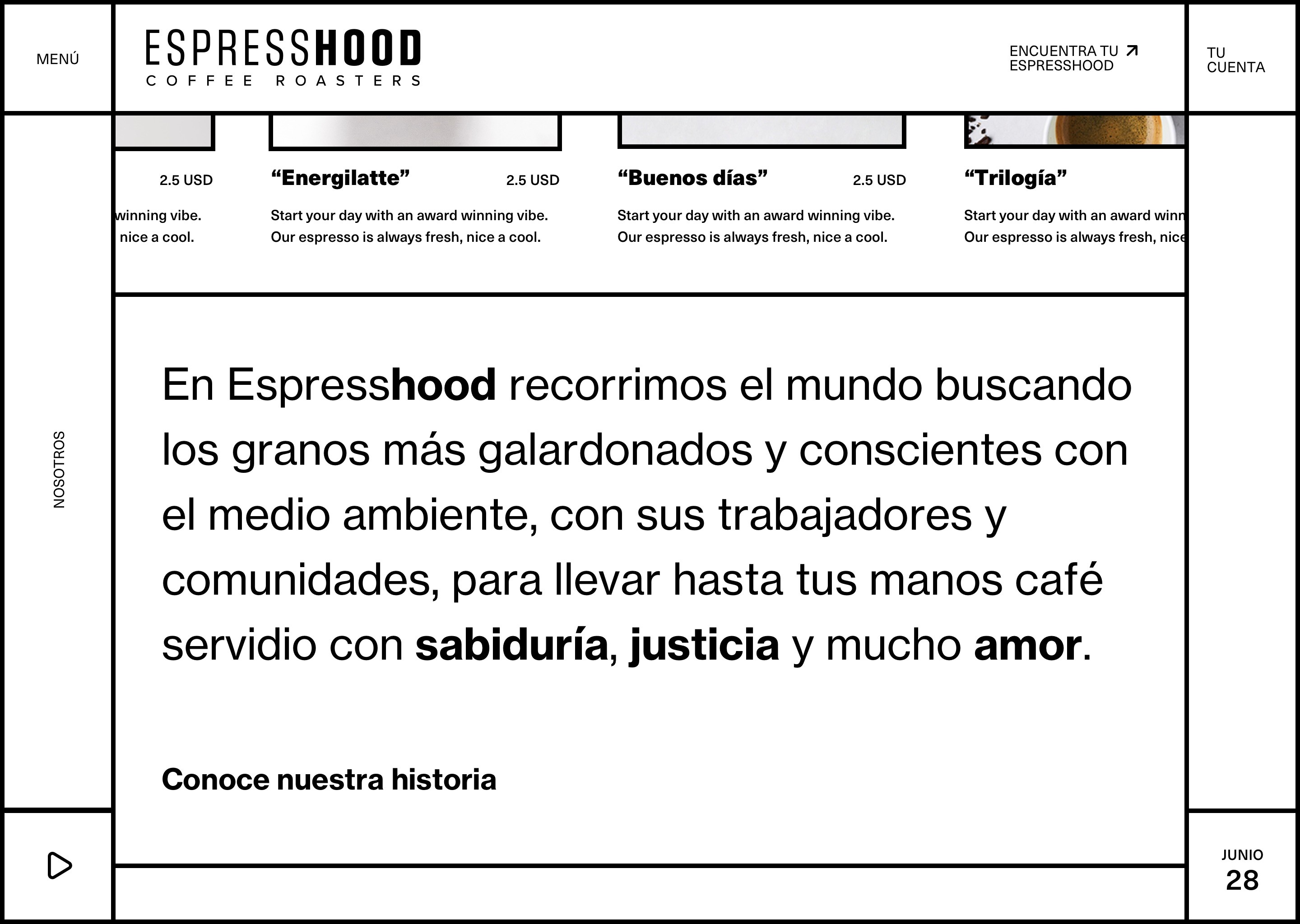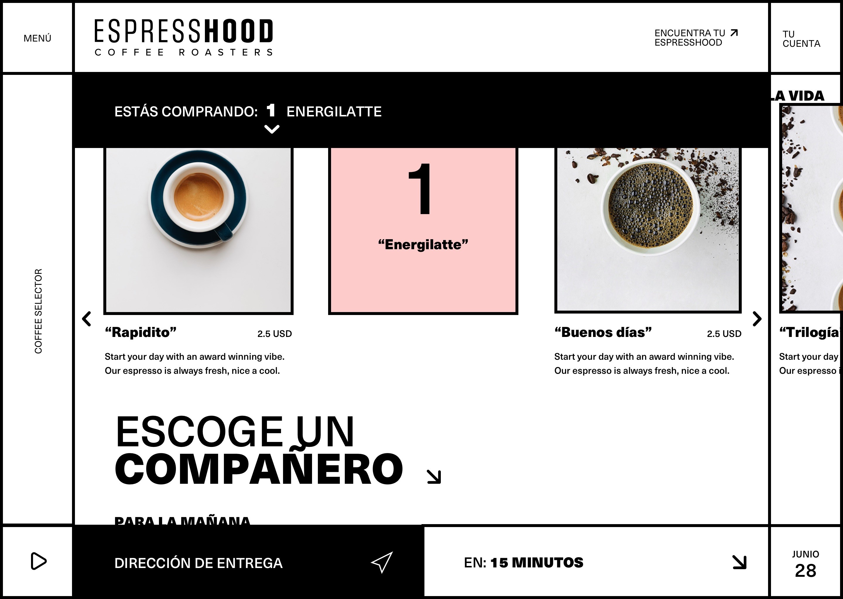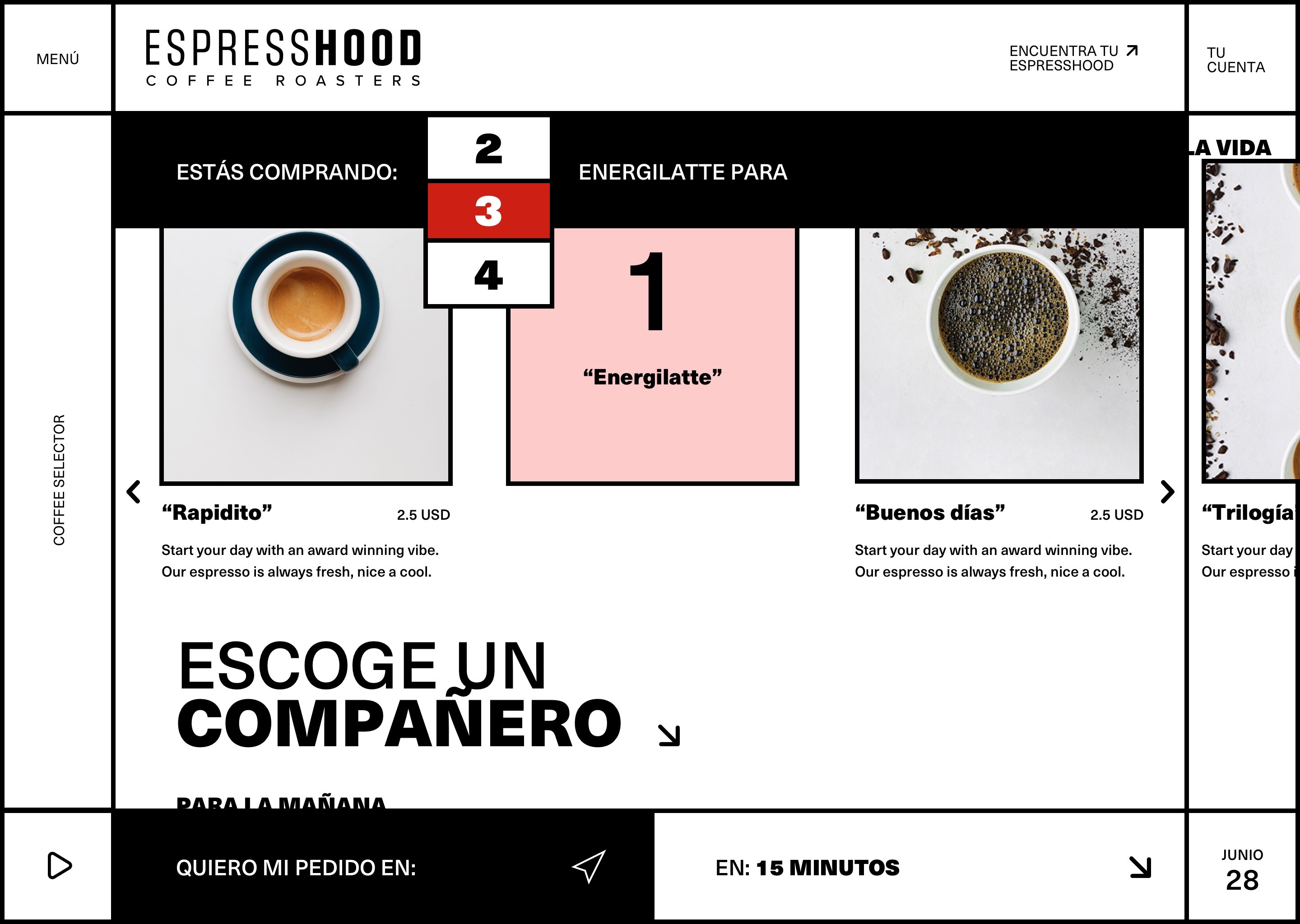 Nuestro análisis nos mostró que el cliente potencial de EspressHood, consideraban que una cafetería brindaba solo servicio rápido y poco comprometido. EspressHood detectó su ventaja competitiva en combinar lo urbano con lo consciente, asumiendo que eficiencia, ética y calidad pueden coexistir. La marca expuso su cualidad única al imaginarse como un movimiento cafetero sustentado por productores, baristas y clientes que comparten principios de justicia y pasión.